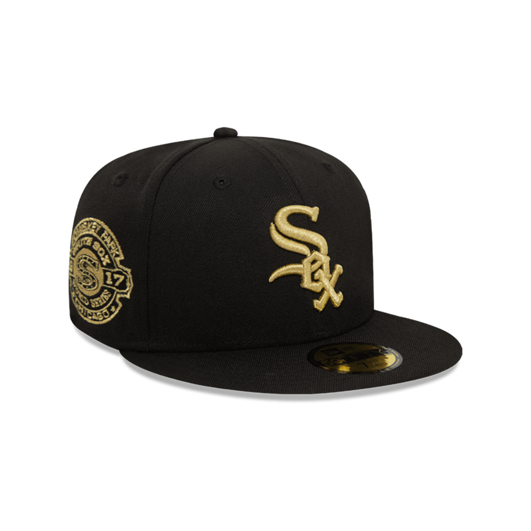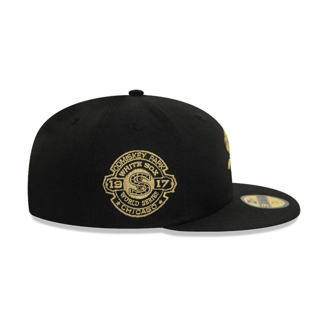Gorra Ner Era Chicago white sox negra logo dorado , plana , cerrada, edicion especial COMISKEY PARK