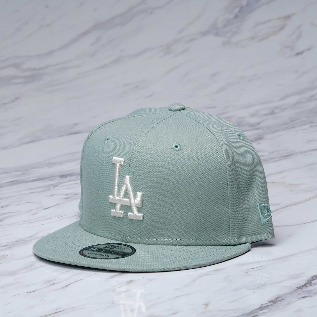 Gorra New Era Los Angeles Dodgers en un tono verde claro o verde menta, el modelo es tipo snapback con visera plana, con cierre ajustable en la parte trasera.